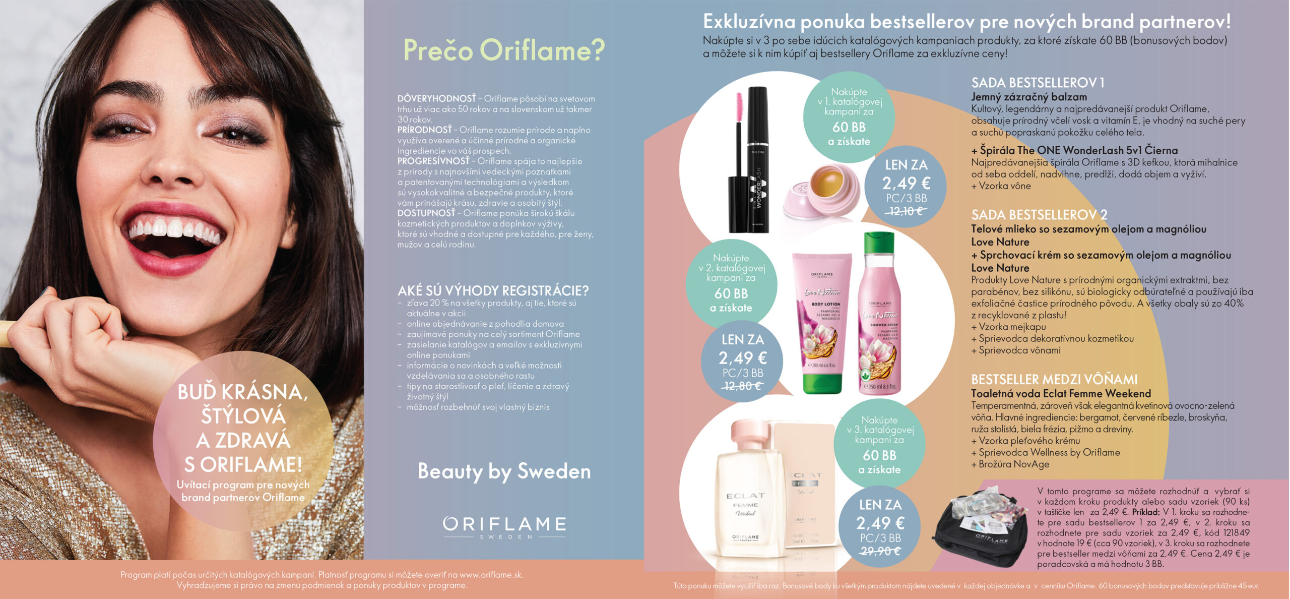 Využite jedinečný program Vitajte v Oriflame, v ktorom môžete získať obľúbené výrobky Oriflame len za 2,49€! Za každý objednaný výrobok získavate body. Stačí podať objednávku za 60 bodov (60€) a získate krásne darčeky. Program trvá 3 kampane/katalógy.